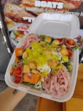 Garden salad topped with ham, salami, pepperoncini, and shredded mozzarella.